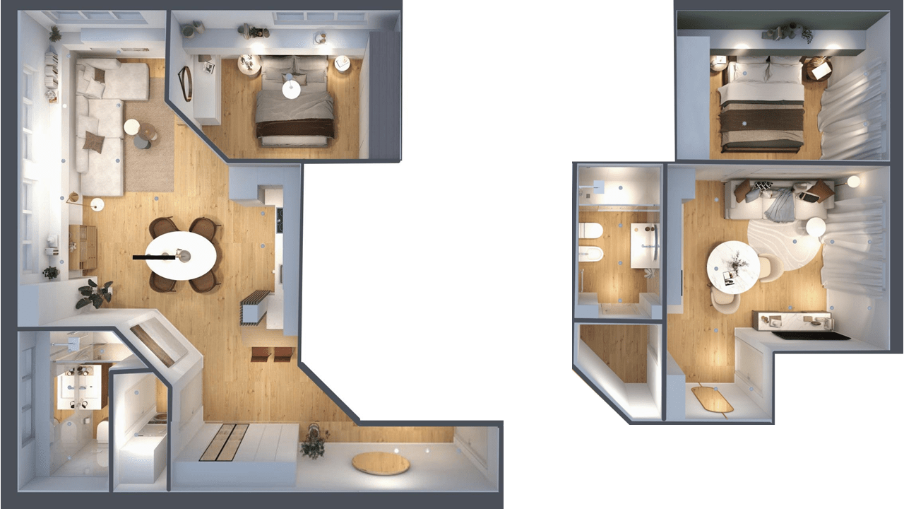 La trasformazione ha valorizzato pienamente il potenziale dell’immobile, dando vita a due bilocali luminosi e piacevoli, perfettamente in linea con le esigenze abitative attuali.